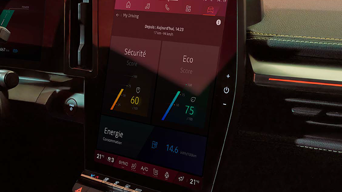 The “safety score” assesses your ability to drive safely by analysing information about speed, trajectory and safety distance as you drive. At the end of each trip, it displays your score from 0 to 100 to help you improve your driving.