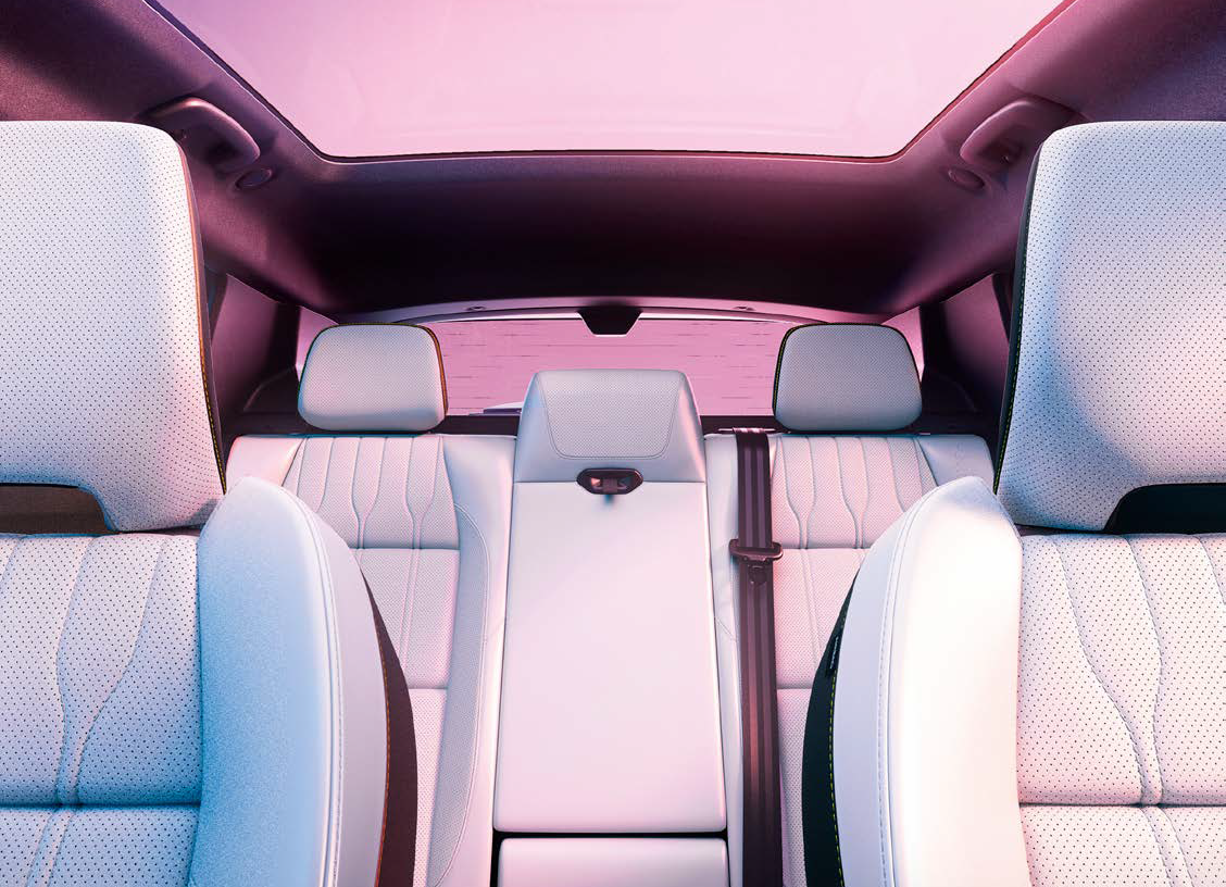 Precision-modelled, the two-tone body features generous curves and sharp edges. Attention to detail, flush door handles and the incorporation of recycled and bio-sourced materials make this an unprecedented family vehicle.